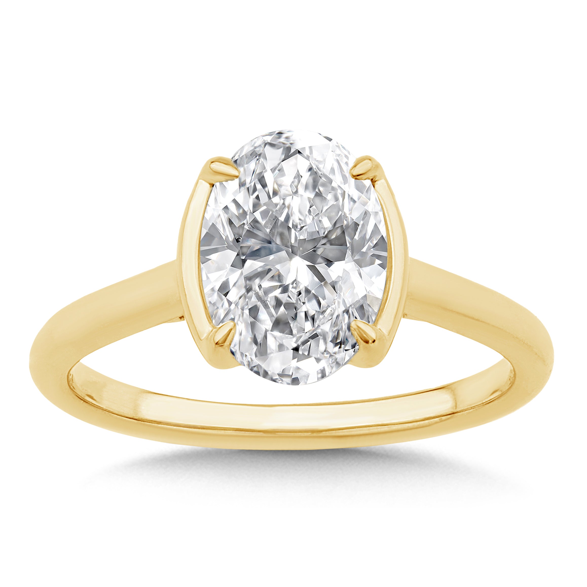 She's mod; she's bold gold; she's THE moment. Exude cool girl, in the most not try-hard sense of the phrase, with this engagement ring. The half bezel adds a structural element that we didn't know was needed to the design of this stunning solitaire. A 2.00ct oval cut lab grown diamond is set into this 18k yellow gold cathedral set ring, featuring 0.10cttw pave set round brilliant cut lab grown diamonds hidden delicately underneath the setting.